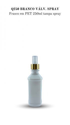 Frasco em PET 250ml quadrado, cor Branca com Spray na cor Dourada.