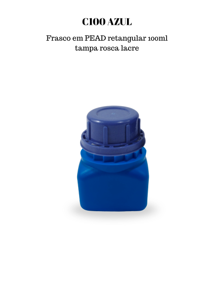 C100AZ- Frasco 100ml AZUL retangular T. 42 - PEAD Linha PEAD Frasco retangular PEAD (polietileno de alta densidade) de 100 ml. Material: PEAD plástico resistente a impactos, com excelente barreira contra água, oxigênio e diversos pro... R$2,24