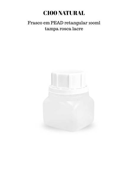 C100N - Frasco 100ml NATURAL retangular T. 42 - PEAD EMBALAGEM POLIETILENO Frasco retangular PEAD (polietileno de alta densidade) de 100 ml. Material: PEAD plástico resistente a impactos, com excelente barreira contra água, oxigênio e diversos pro... R$2,05