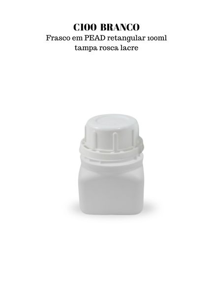 C100BR- Frasco 100ml BRANCO retangular T. 42 - PEAD 35mL Frasco retangular PEAD (polietileno de alta densidade) de 100 ml. Material: PEAD plástico resistente a impactos, com excelente barreira contra água, oxigênio e diversos pro... R$2,24